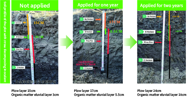 The degradation rate of straw applied with organic material decomposing agent reaches more than 80%, which is 23.54% - 26.83% higher than that of the control, and the organic matter content is significantly increased.