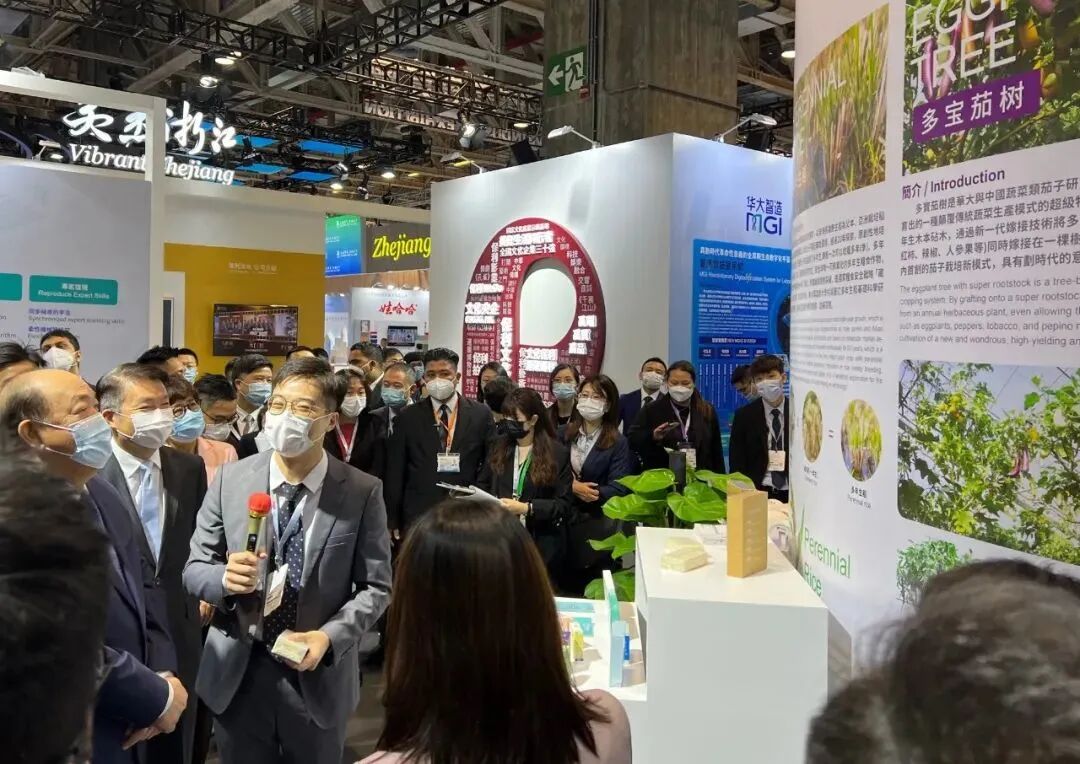 Ho Iat-seng, Chief Executive of the Macao Special Administrative Region, Lu Shan, Vice Governor of Zhejiang Province, and other distinguished guests listened to the scientific stories behind the two "super species" during their visit to BGI's booth, and expressed recognition for "Manla No. 1" Perennial Rice.