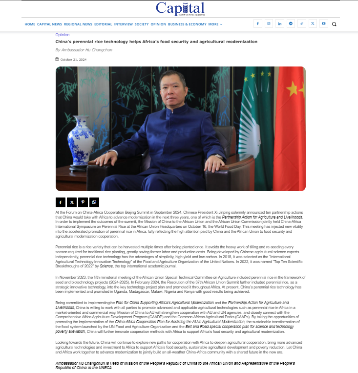On October 20, Ambassador Hu Changchun, Head of the Chinese Mission to the African Union, published a signed article titled “China’s Perennial Rice Technology Helps Africa’s Food Security and Agricultural Modernization” in the Ethiopian media outlet Capital. The article emphasizes the importance of earnestly implementing key outcomes such as the “Agriculture and Livelihood Partnership Action” proposed by President Xi Jinping at the Forum on China–Africa Cooperation (FOCAC) Summit. It also demonstrates to African friends how China’s perennial rice technology contributes to food security and agricultural modernization across the African continent, while looking ahead to the broad prospects of China–Africa cooperation. The full text is as follows:
