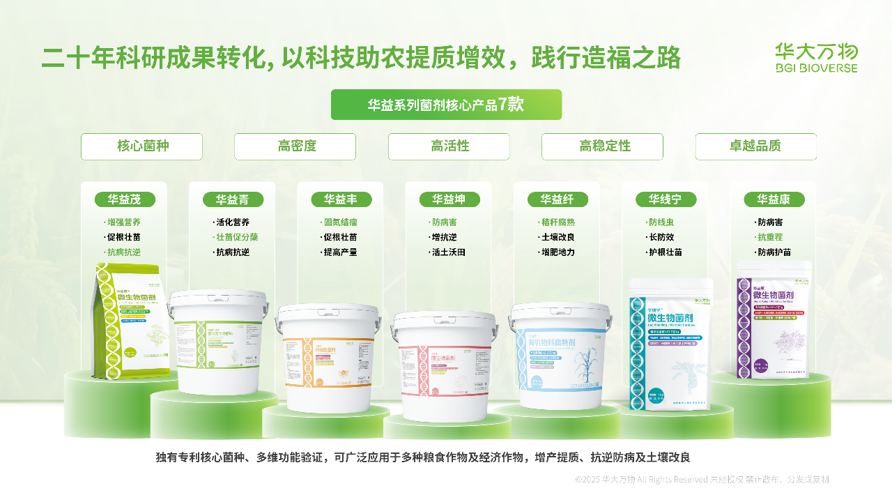 Over the past 15+ years, leveraging a globally leading big-data platform, BGI has built a vast agricultural microbial resources database, digitizing more than 100,000 soil samples across 20 provinces nationwide, encompassing diverse soil types and crop-associated microbial resources. Based on the principle of “from the soil, back to the soil,” BGI has formulated multiple microbial products tailored to different crops and regions, aiming to activate the rhizosphere micro-ecosystem, revitalize soil vitality, and achieve fertilizer reduction with efficiency gains and green pest control for sustainable agriculture.