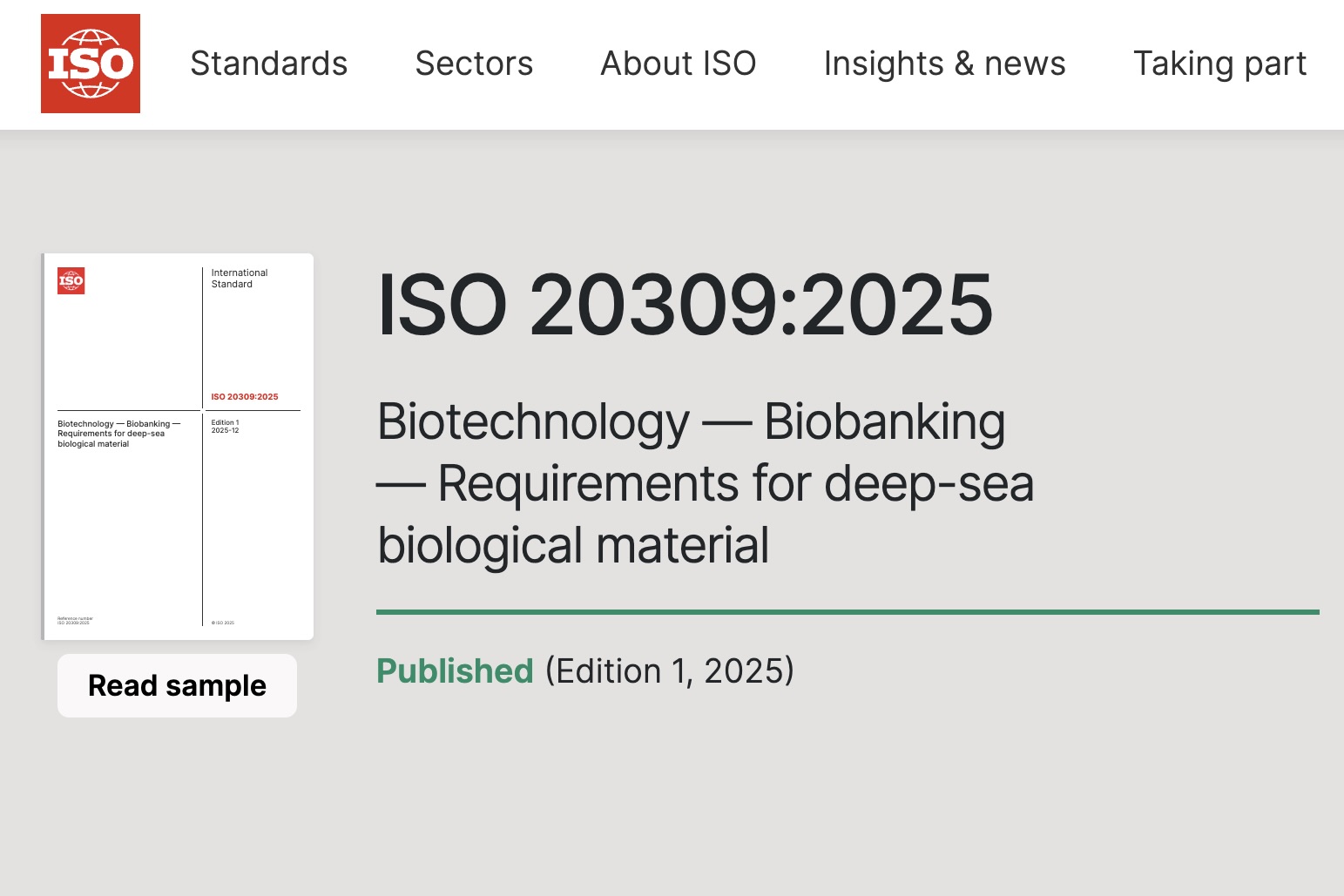 ISO 20309:2025 Biotechnology — Biobanking — Requirements for deep-sea biological material has been officially released by the International Organization for Standardization (ISO).