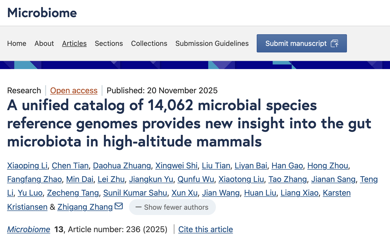 Yunnan University and BGI-Research have successfully constructed a reference set of 14,062 gut microbiota from animals living on the Qinghai-Tibet Plateau, revealing rich microbial resources. The results were reported online on November 20, 2025, in the scientific journal Microbiome in a paper titled “A Unified Catalog of 14,062 Microbial Species Reference Genomes Provides New Insight into the Gut Microbiota in High Altitude Mammals”.