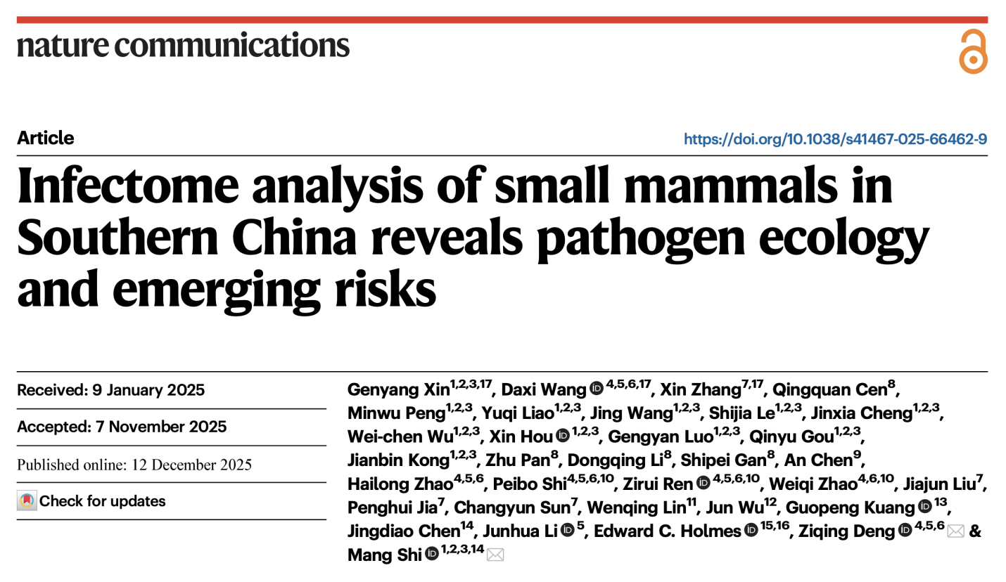 The study “Infectome analysis of small mammals in Southern China reveals pathogen ecology and emerging risks” was published open access in Nature Communications (Published 12 December 2025; DOI: 10.1038/s41467-025-66462-9).