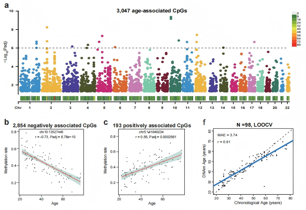 Genome-wide identification of 3,047 age-associated CpGs mapped to 1,587 genes, distilled into a 125-CpG epigenetic clock with 0.91 correlation to chronological age, advancing understanding of aging biology and disease risk assessment.