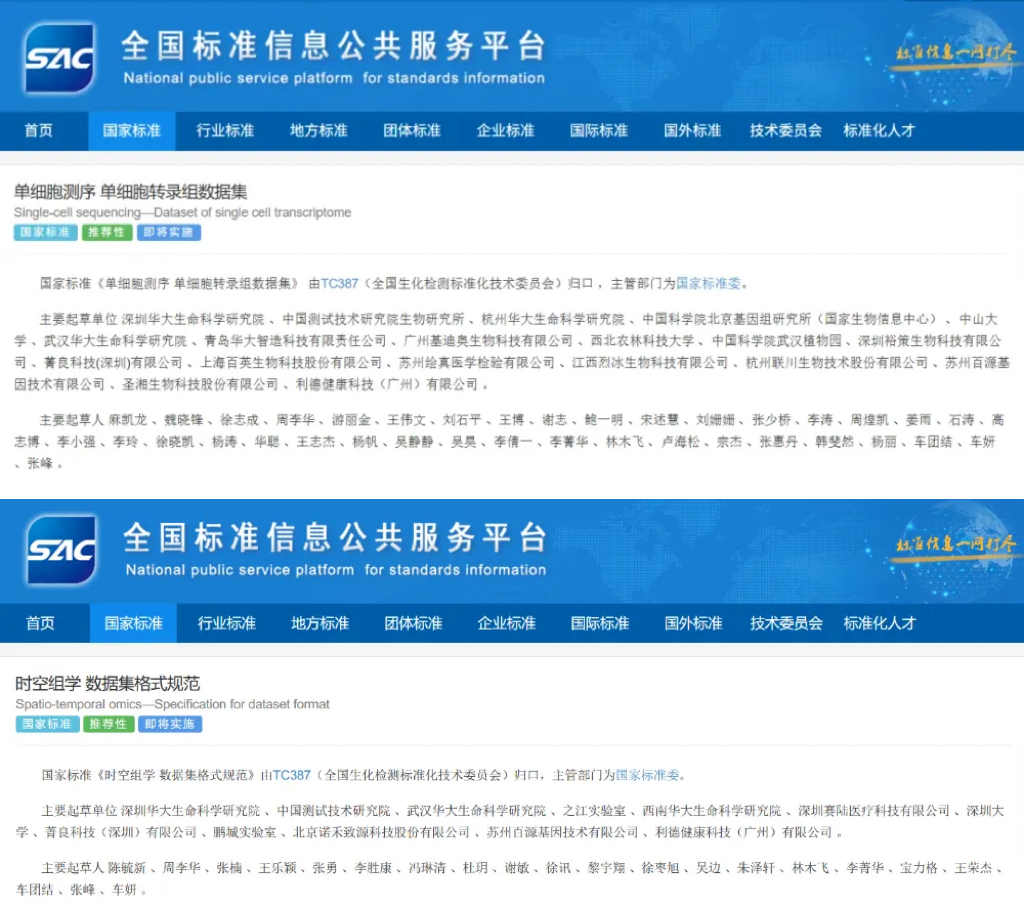 Two China national standards proposed and drafted under the leadership of BGI-Research have been officially released: GB/T 46927-2025, "Spatio-temporal omics—Specification for dataset format", and GB/T 46935-2025, "Single-cell sequencing—Dataset of single cell transcriptome". These standards will come into effect on July 1, 2026.