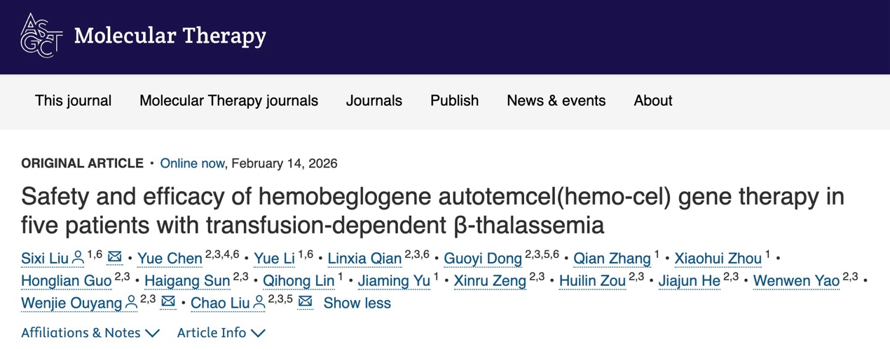 The study “Safety and efficacy of hemobeglogene autotemcel(hemo-cel) gene therapy in five patients with transfusion-dependent β-thalassemia” was published in Molecular Therapy.