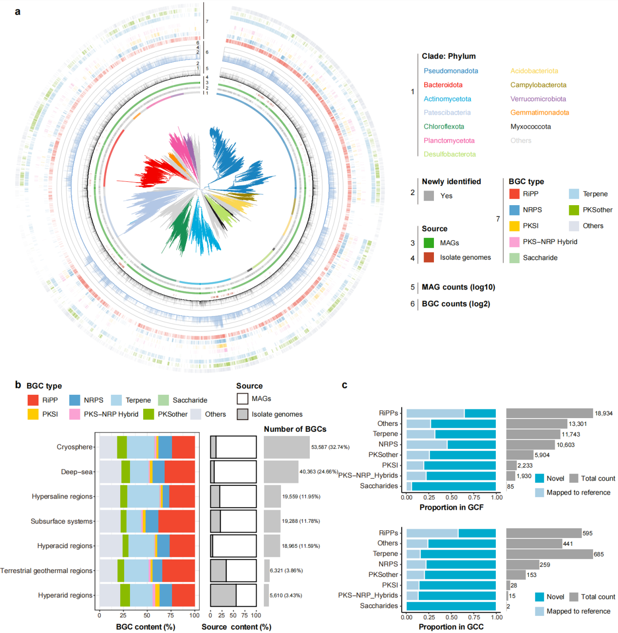 Using antiSMASH, the team identified 163,693 biosynthetic gene clusters (BGCs)—genomic regions that encode specialized metabolites, including many known classes of antibiotics.. These clusters were grouped into 64,733 families, with over half showing no similarity to known references, pointing to a vast reservoir of uncharted chemistry. Among the BGCs, ribosomally synthesized and post-translationally modified peptides (RiPPs) are of particular interest, as they are well-established as a rich source of antimicrobial peptides. They account for 28.60% of all identified clusters. Archaea further expand this landscape: 99.72% of archaeal BGC families are lineage-specific, revealing a largely unexplored biosynthetic space with potential implications for future antibiotic discovery.