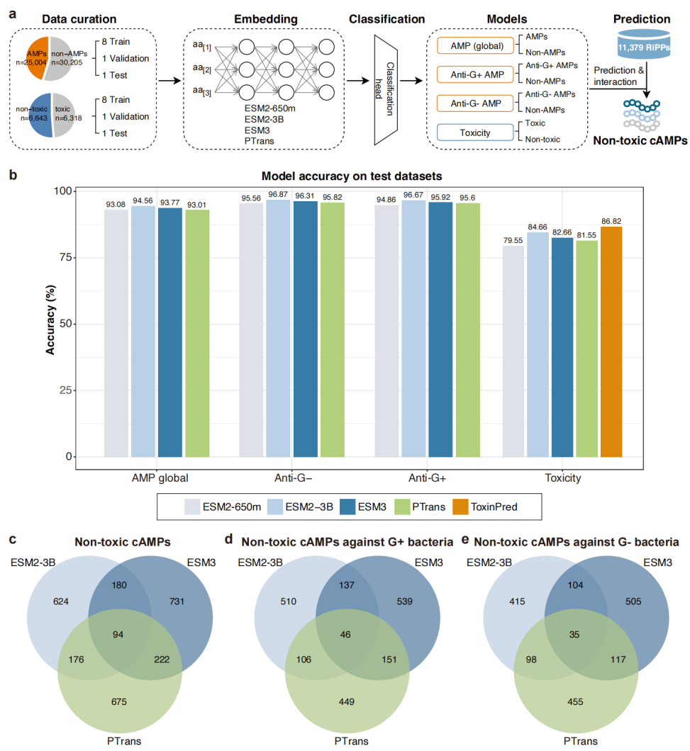 To translate this genetic potential into testable molecules, the team developed a framework called Metagenomics-AI (MAI). MAI leverages protein large language models to jointly evaluate peptide sequences for antimicrobial activity and mammalian toxicity, addressing a key limitation in peptide discovery: many candidates fail due to toxicity rather than lack of potency. Applied to 11,379 peptide sequences extracted from RiPP gene clusters, MAI prioritized 3,032 candidates predicted to be both active and non-toxic. The largest model tested, ESM2 with 3 billion parameters, outperformed established antimicrobial peptide predictors by more than 10 percentage points. Notably, most shortlisted peptides show low sequence similarity to the training data, suggesting strong potential for novel chemical space exploration.