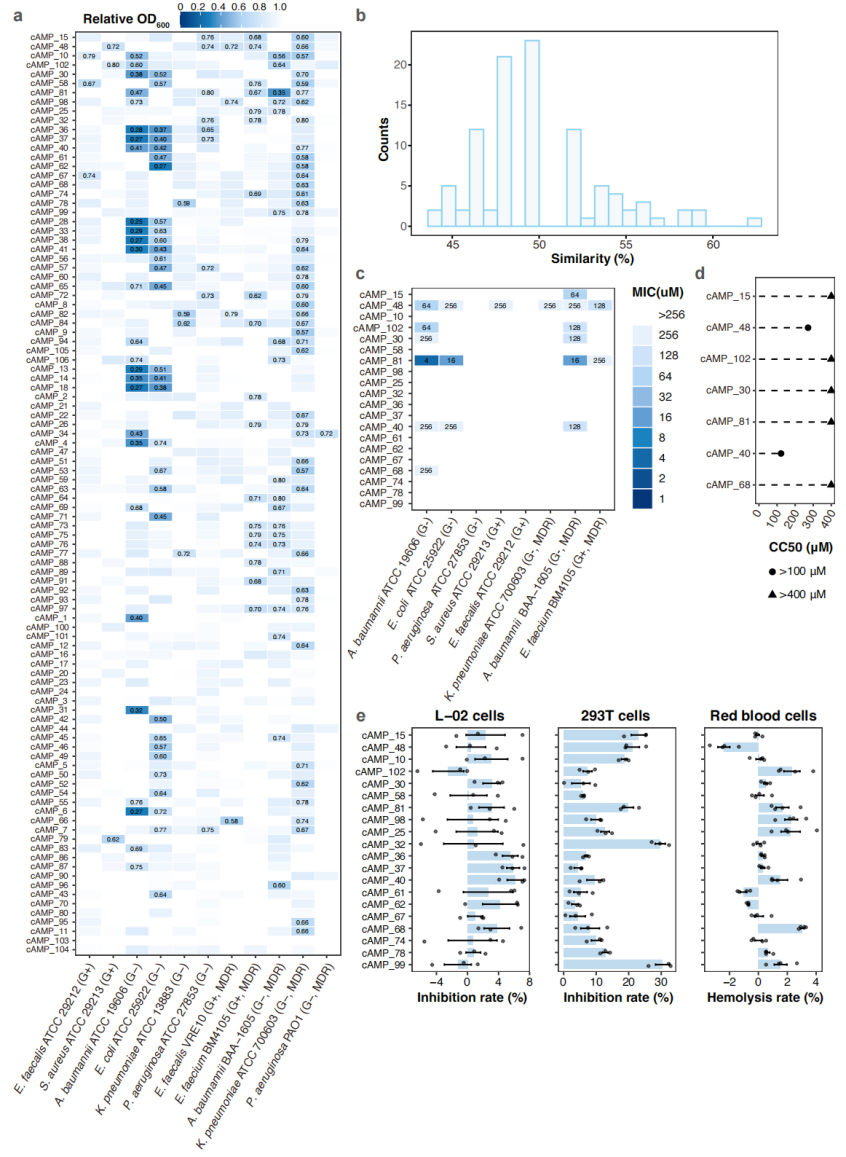 To validate the computational predictions, the team synthesized 100 shortlisted peptides and tested them against 11 bacterial strains, including several multidrug-resistant pathogens. Among them, 84 peptides inhibited at least one strain, while toxicity assays showed generally low hemolysis and low cytotoxicity in human cell lines. One candidate, cAMP_81, showed particularly strong activity against Gram-negative pathogens, with minimum inhibitory concentrations as low as 4 μM against Acinetobacter baumannii and 16 μM against both Escherichia coli and a multidrug-resistant A. baumannii strain, comparable to or better than published positive controls. Mechanistic studies, including electron microscopy and membrane integrity assays, suggested that cAMP_81 primarily acts by disrupting the bacterial cytoplasmic membrane. Importantly, bacteria exposed to sublethal daily doses over 30 days developed less resistance than those treated with polymyxin B, a last-resort antibiotic. These results were obtained from in vitro assays of unmodified precursor peptides and do not constitute clinical evidence.