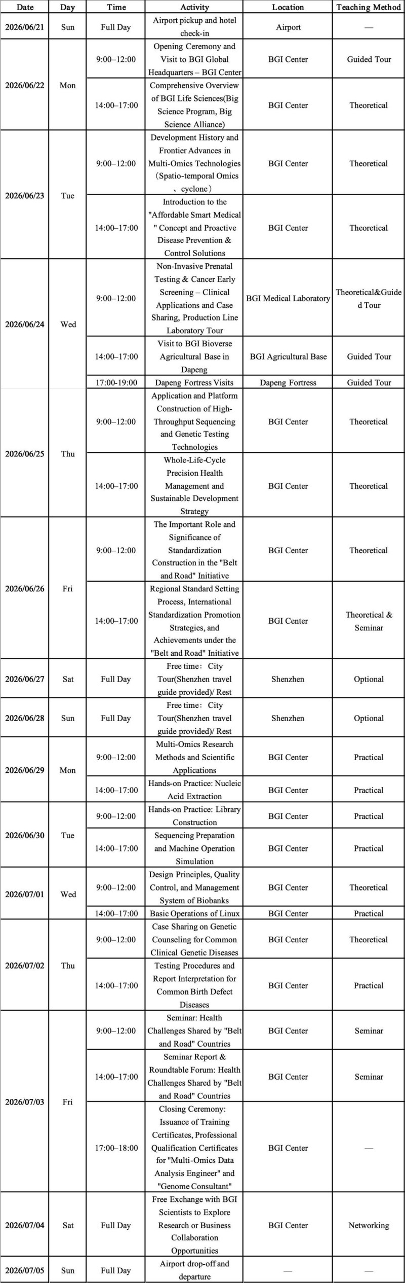 Taking place June 21st – July 5th, 2026, in Shenzhen, BGI Group extends a warm welcome to your participation in the course of Applicable Smart Medical Technology Training Program for "Belt and Road" Countries. Organized by BGI College, this 15-day program is designed for mid- to senior-level professionals in biotechnology, medicine, and life sciences from universities, hospitals, and research institutions in ASEAN and other Belt and Road partner countries.